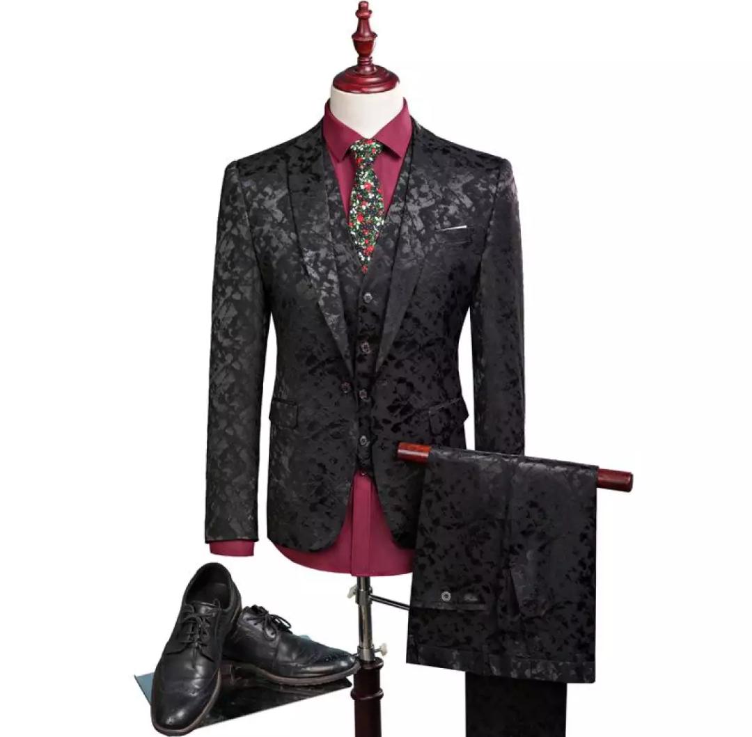 Black flowered suit for men.